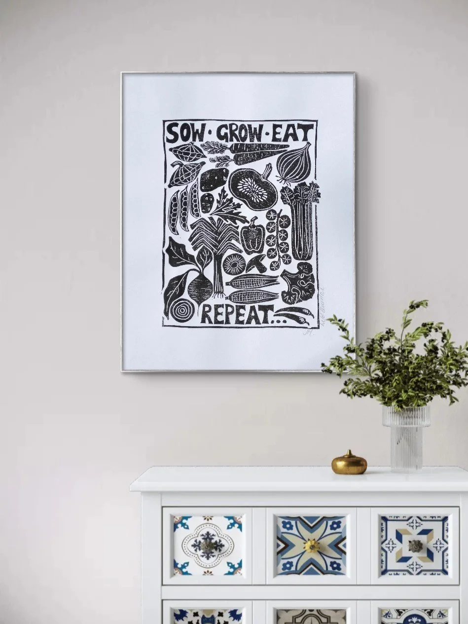 Hand Printed Art to Bring Joy… Tatty Jackdaw Lino Print by Wild Blue Studio. Limited Edition of 12 £25.00 Dragonfly and Hogweed Lino Print by Wild Blue Studio £20.00 Leaping Hare Lino Print by Wild Blue Studio £20.00 Wild Blue Hare Lino Print by Wild Blue Studio £20.00 To The Stars Lino Print by Wild Blue Studio £20.00 Sea Birds Lino Print by Wild Blue Studio £20.00 Freezing Lino Print by Wild Blue Studio £20.00 Come On In Lino Print by Wild Blue Studio £20.00 Tree Of Life Lino Print by Wild Blue Studio £20.00 Ammonite Lino Print by Wild Blue Studio £20.00 Sow Grow Eat Repeat Lino Print by Wild Blue Studio £20.00 Wild Waves Lino Print by Wild Blue Studio £20.00 Lino Print Hare with Valentine Heart, Handprinted on Khadi Paper £10.00